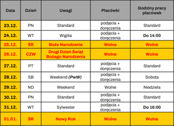 - W dniach 24 -26 grudnia nie będą realizowane odbiory oraz dostawy.